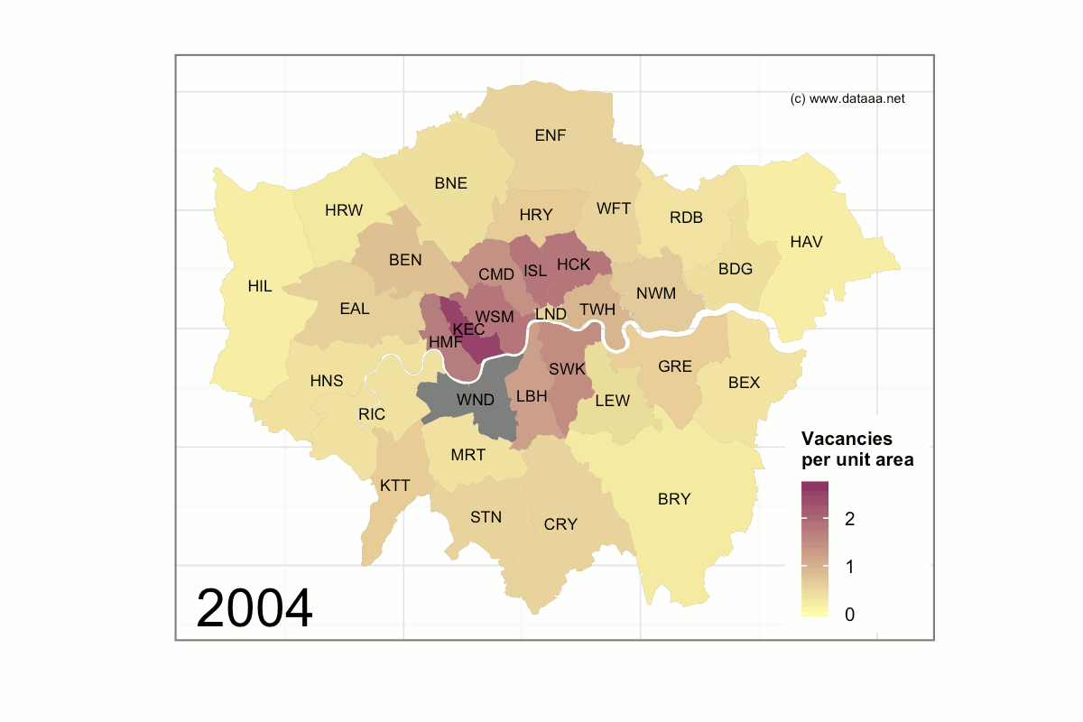 Given these pressures, councils in London are turning their attention to vacant buildings, and developing strategies for populating them where possible. It seems to be working. I pulled some data on vacant buildings from the London Datastore, and put together this animated visualisation in an attractive "rhubarb and custard" colour scheme: